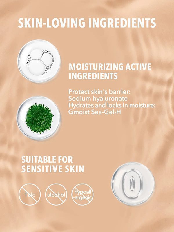 با چند حرکت برس آرایشی سریعتر از همیشه پوشش دهی بالا و پوستی بی عیب و نقصی داشته باشید. فرمول انحصاری بدون چربی ما برای استفاده طولانی مدت است و از سیستم امولسیون روغن در آب استفاده می کند که با قوام نازک به پوست می چسبد. فرمول آنتی اکسیدانی با ماندگاری ما دارای یک پودر از پیش مخلوط شده 10 تا 25 میکرونی با استفاده از فناوری بسته بندی اسید آمینه برای مقاومت در برابر چربی و عرق برای آرایش بدون کدر شدن می باشد. ترکیبات فعال دارای هیالورونات سدیم و Gmoist®Sea-Gel-H (عصاره fucus vesiculosus )برای مرطوب کردن هستند. ” بدون تالک و الکل”