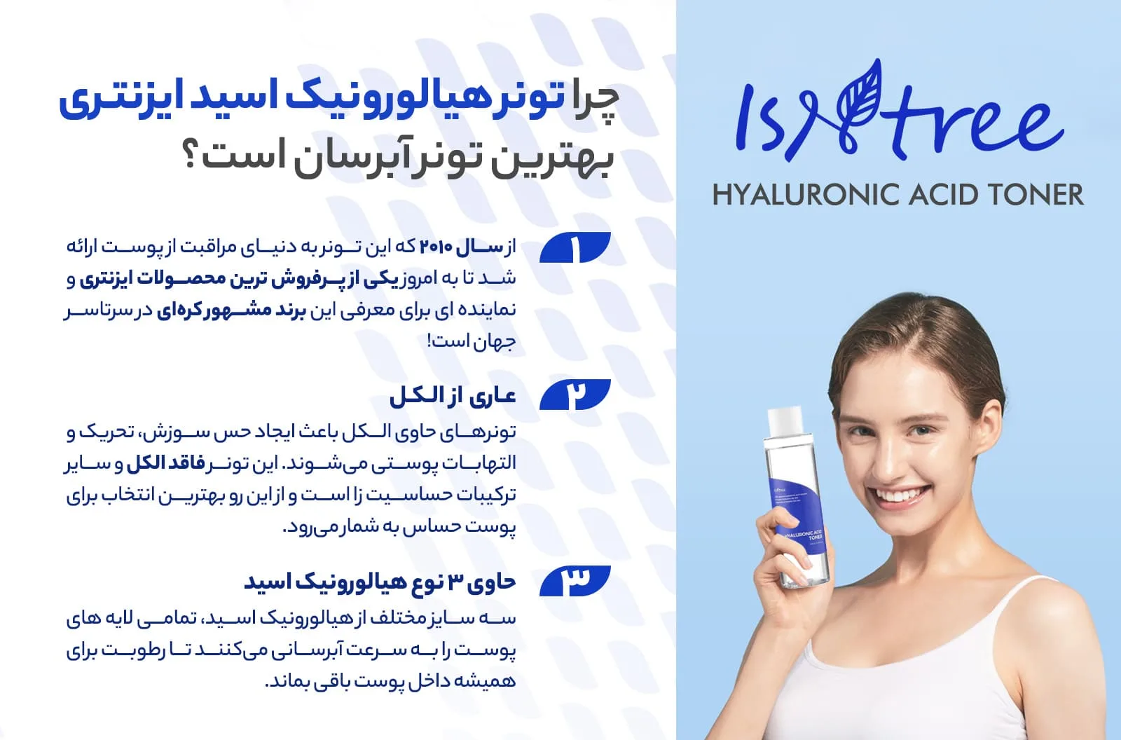 تونر آبرسان هیالورونیک اسید ایزنتری Isntree یک محصول مراقبت از پوست است که به دلیل ویژگیهای مرطوبکننده و آبرسانی خود، محبوبیت زیادی کسب کرده است. در زیر یک مرور اجمالی از این محصول آورده شده است: