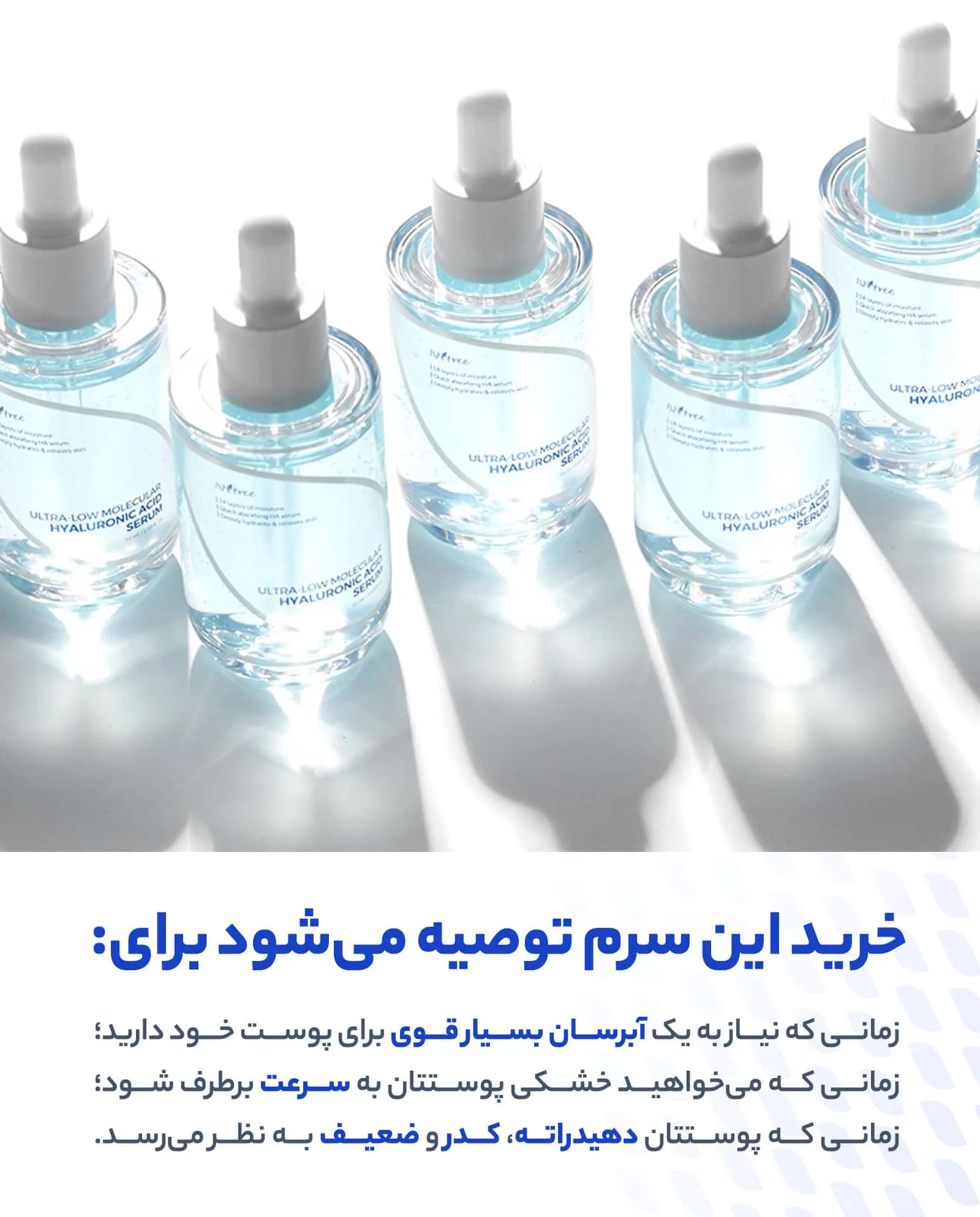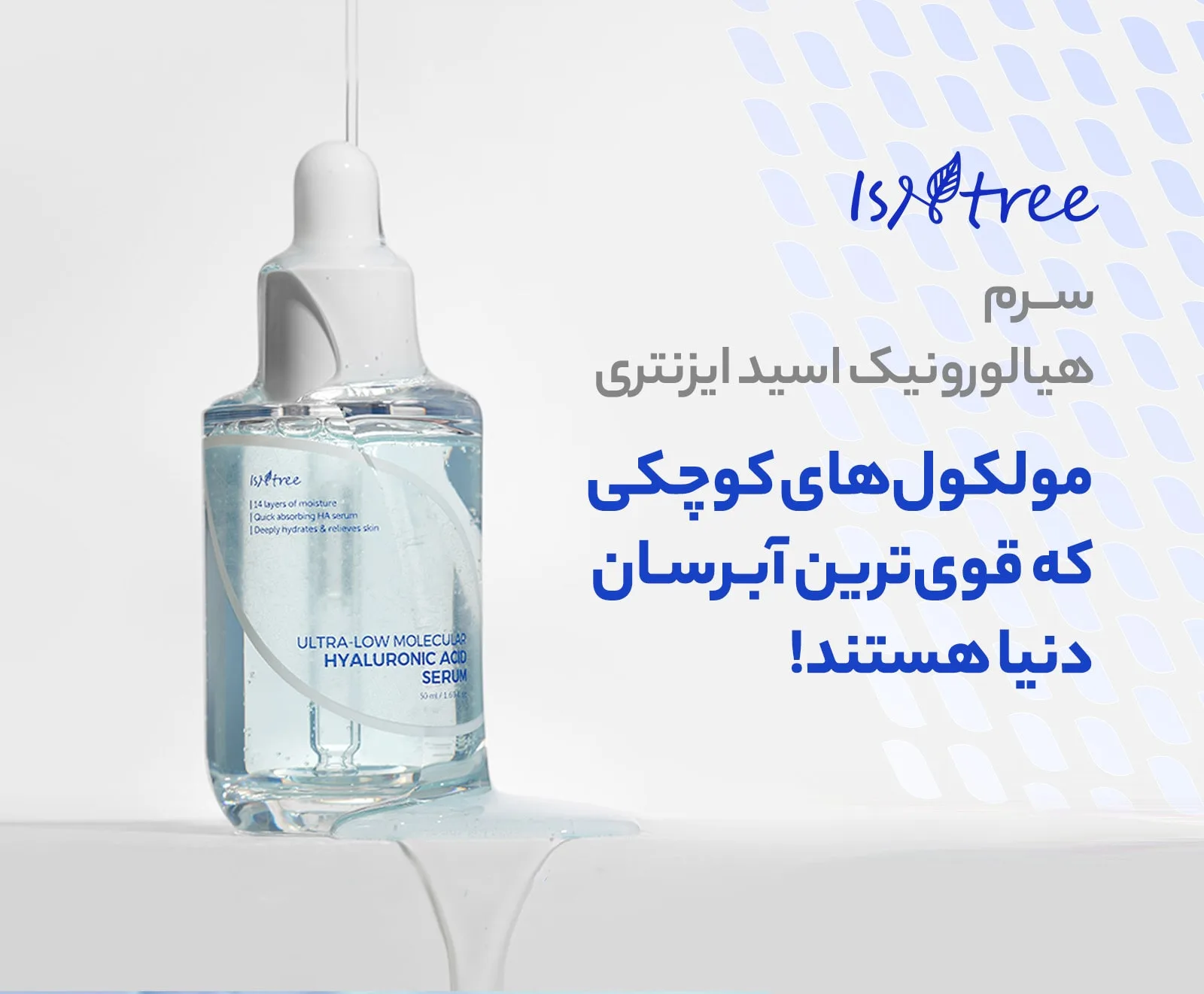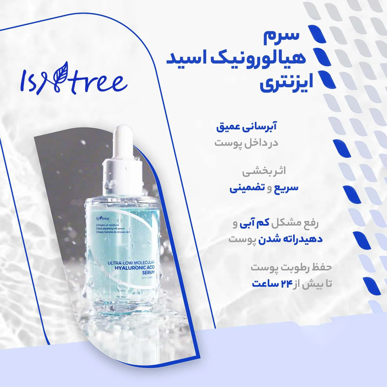 سرم هیالورونیک‌ اسید Ultra-Low Molecular ایزنتری ۵۰ میل Isntree ، یک ابرآبرسان برای پوست است که توانایی جذب آب تا ۱۰۰۰ برابر وزن خود را دارد. این ترکیب خالص هیالورونیک اسید که در سرم هیالورونیک اسید ایزنتری به کار رفته است، منجر به آبرسانی عمیق، حجیم شدن پوست، و کاهش چین و چروک‌های صورت می‌شود.