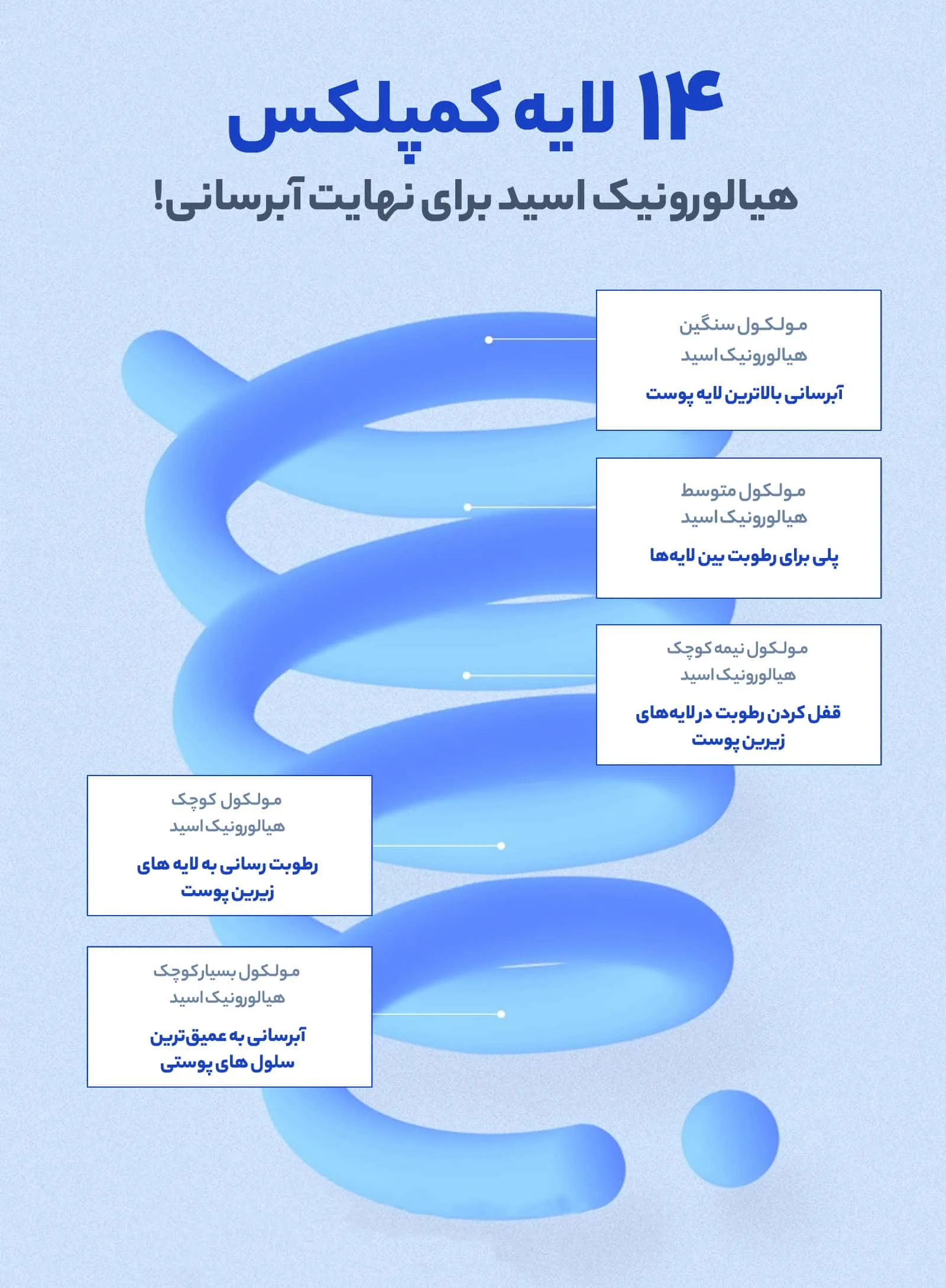 • ۱۴ لایه کمپلکس هیالورونیک اسید: برای نهایت آبرسانی، شامل مولکول‌های سنگین تا بسیار کوچک هیالورونیک اسید.