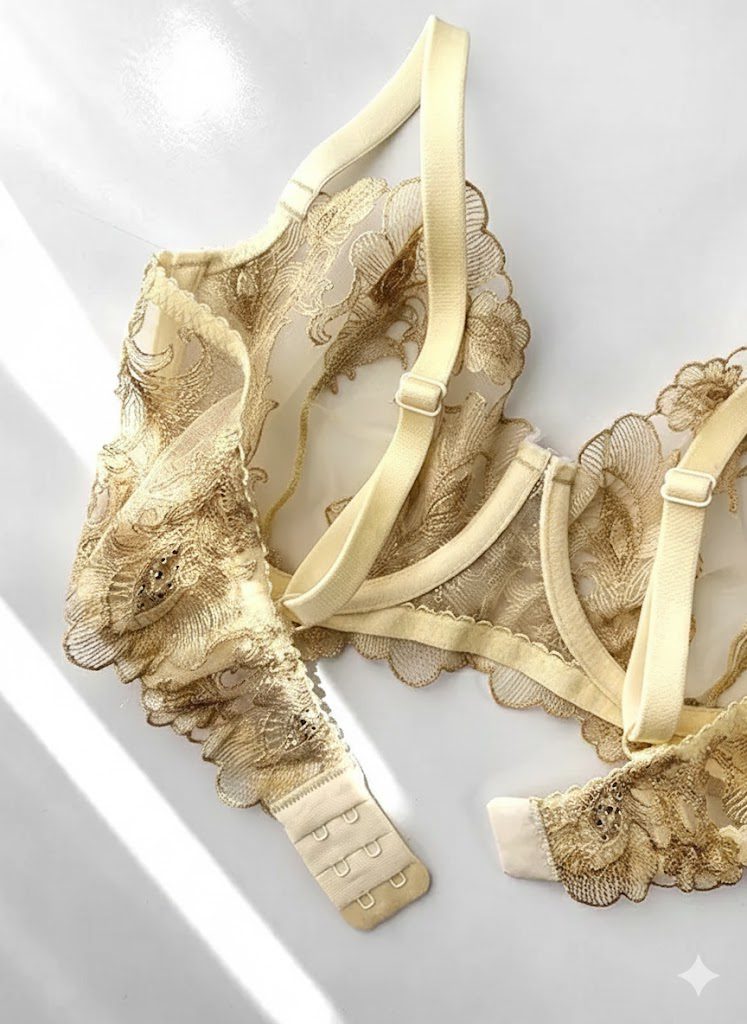 🛍️ خرید ست شورت و سوتین توری گیپوری فنردار طلایی دانلا