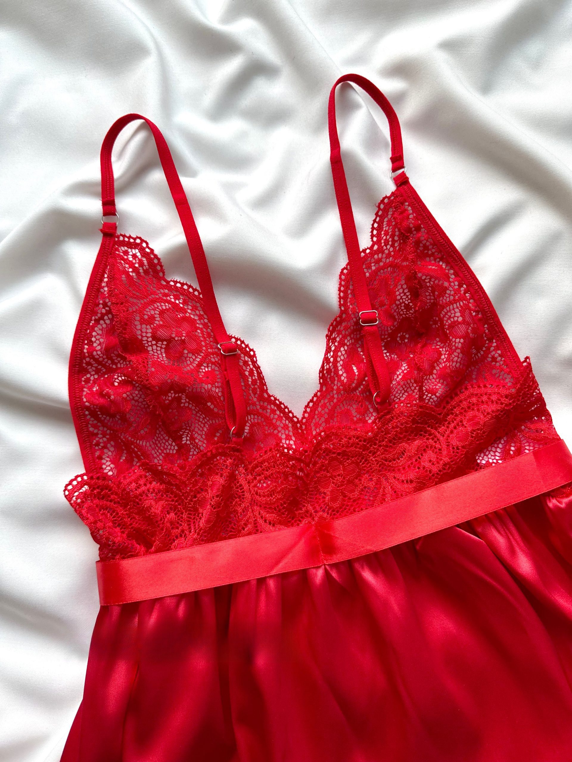 ست لباس خواب ساتن بغل چاک قرمز دانلا