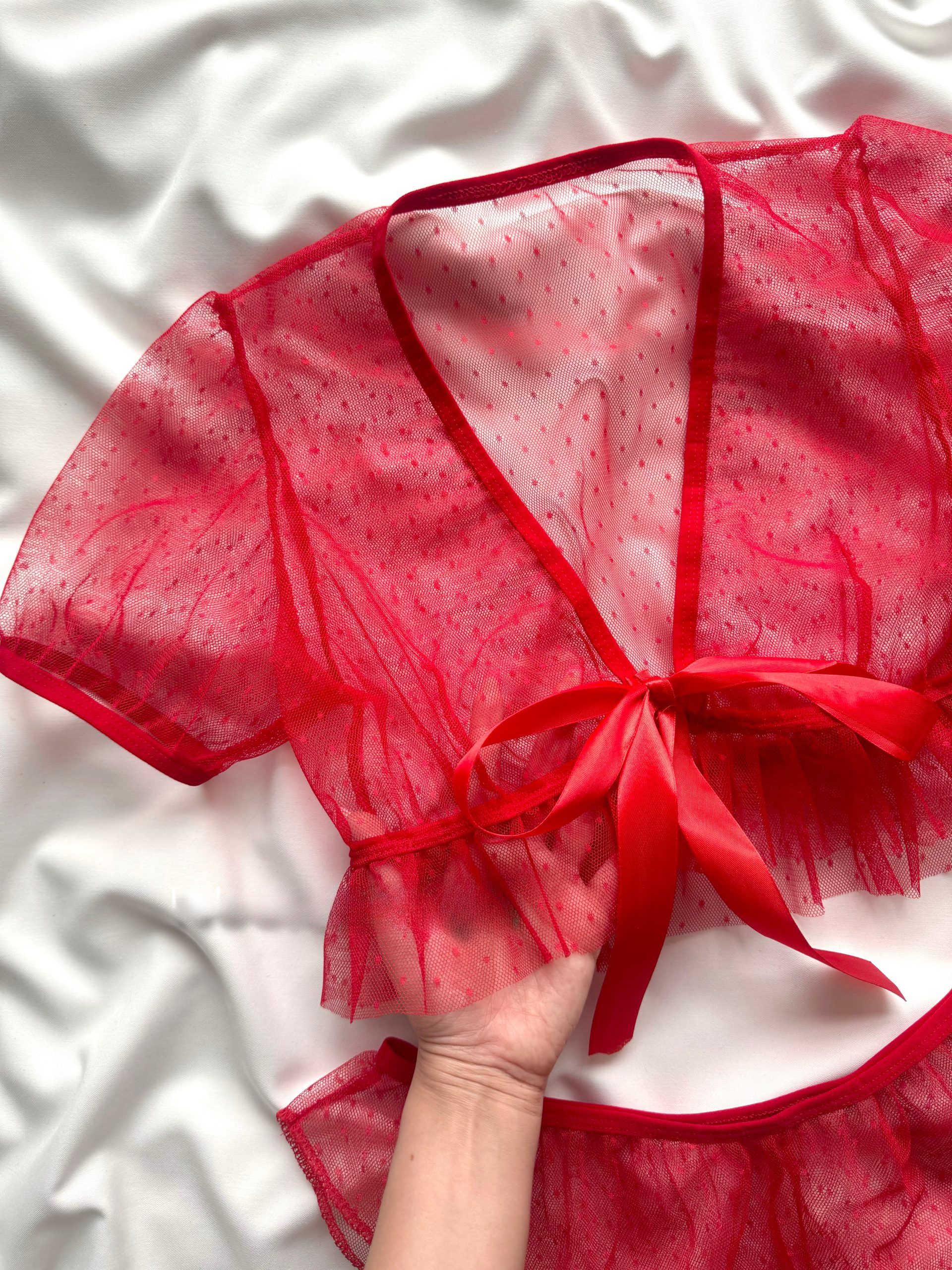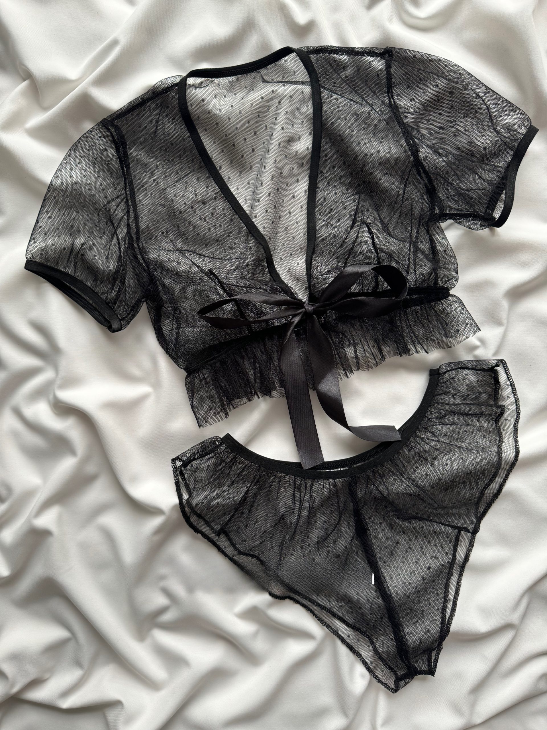 نیمتنه با فرم آزاد و بندهای قابل تنظیم، راحتی و زیبایی را همزمان فراهم میکند. شورت توری با طرح خالخالی و بافت شفاف، جلوهای بازیگوش و تحریککننده دارد که استایل شما را خاصتر و جذابتر میسازد.
